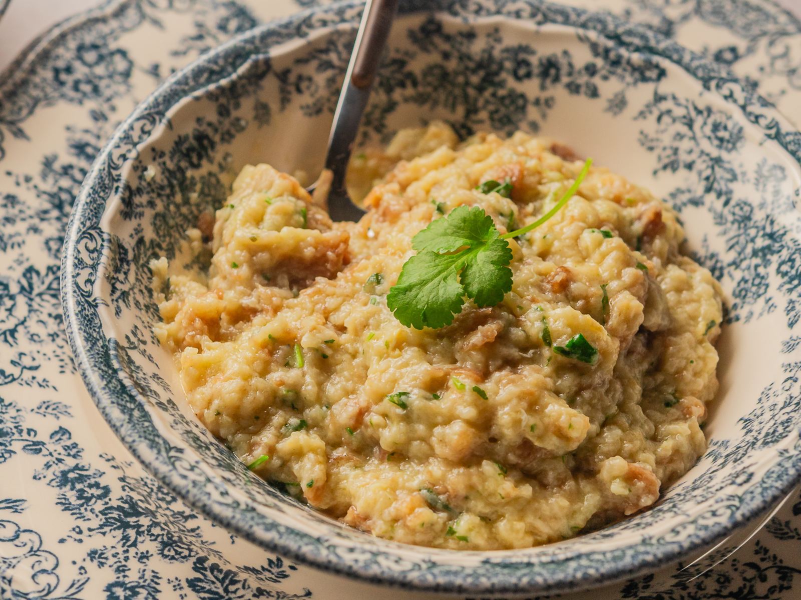 Coloque os dentes de alho num almofariz, adicione uma pitada de sal e esmague até obter uma pasta. Aqueça um tacho com azeite. Adicione o alho e junte o miolo de pão aos poucos e metade dos coentros.