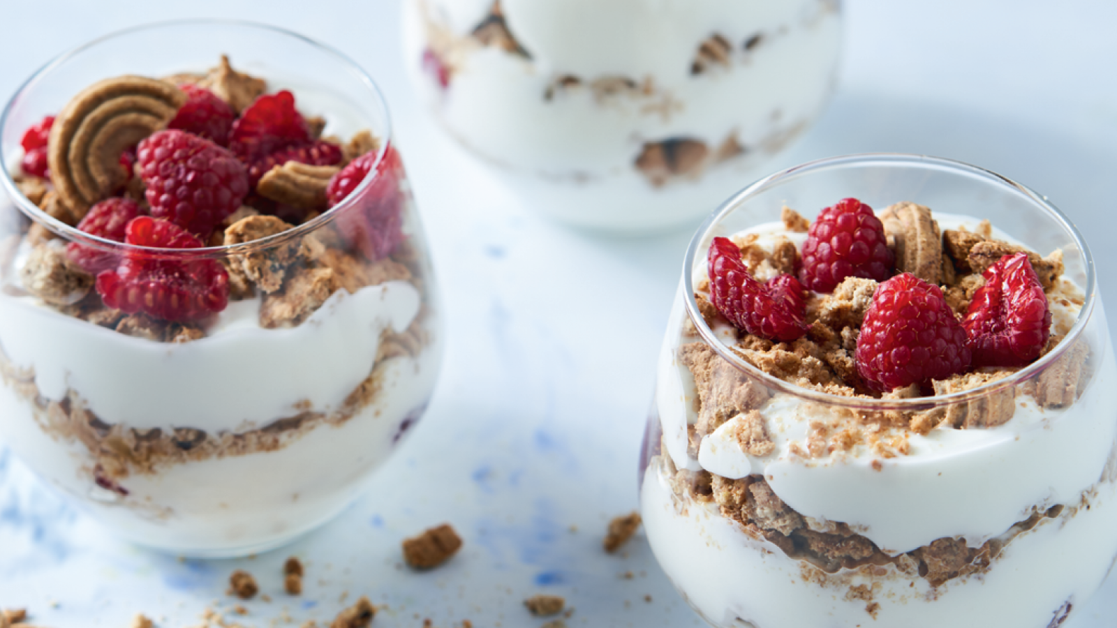 Divida 2 iogurtes gregos naturais por 4 copos e de seguida distribua metade das bolachas por cima. Volte a dividir mais 2 iogurtes gregos naturais pelos copos, acrescente as restantes bolachas e termine com 150 g de framboesas frescas. Sirva de seguida.